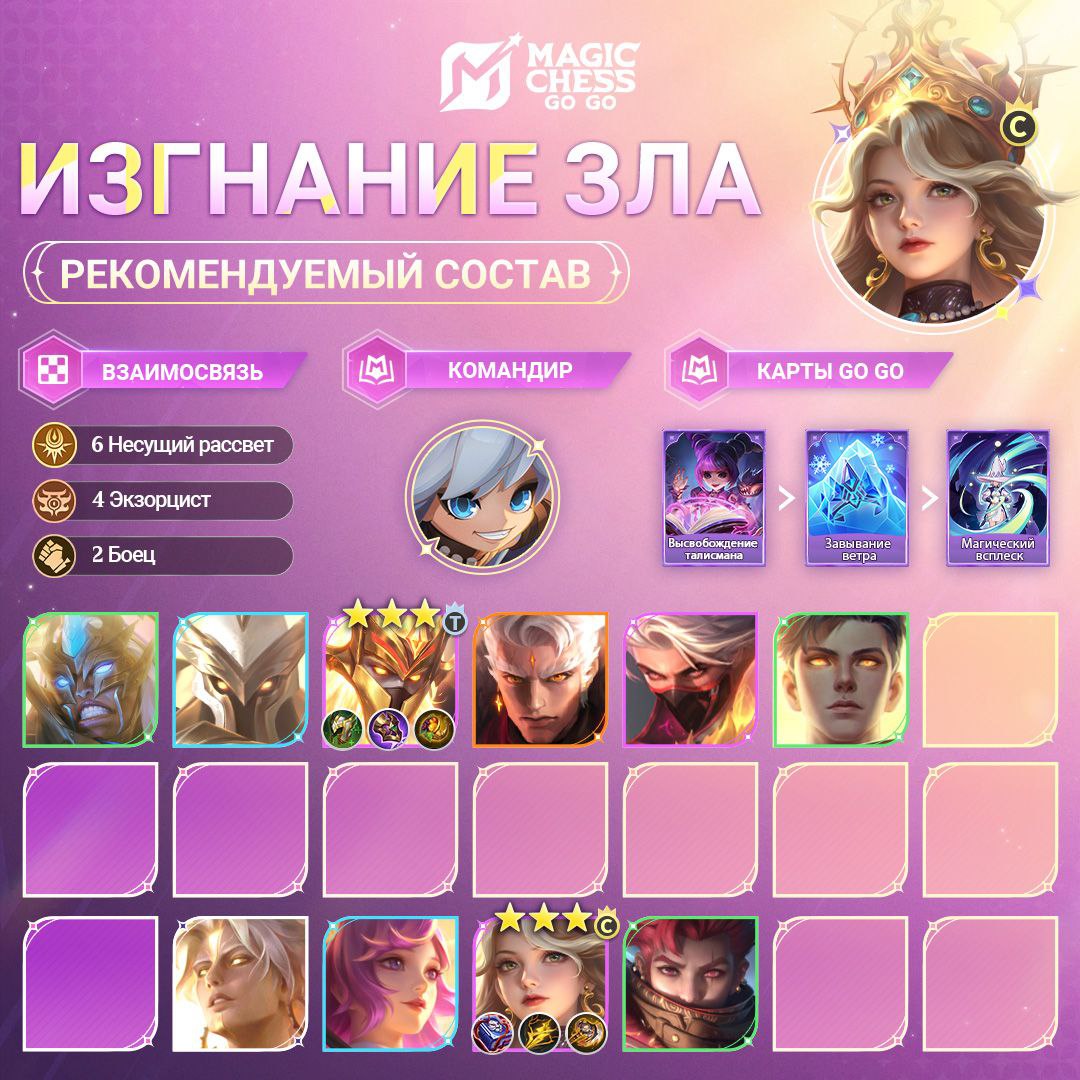Стратегия: в первую очередь собирайте героев Несущего рассвет для усиления взаимосвязи. В ранней игре активируйте 4 Несущих рассвет, 2 Магов и 2 Экзорцистов, чтобы добиться полосы побед и плавно перейти к следующему этапу. В коробке Go Go в приоритете герои Несущего рассвет, затем снаряжение для основного керри.