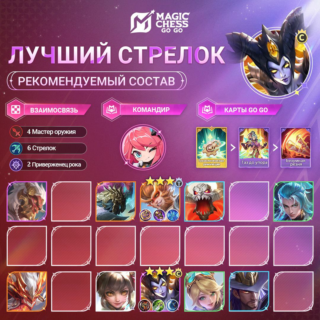 На ур. 9 ищите Альфу или Москова для активации 6 Стрелков или 2 Теневого ткача — состав начинает формироваться. Сохраняйте золото для достижения ур. 10 и стремитесь найти Москова и Иритель для повышения звездного уровня — тогда вас уже не остановить.