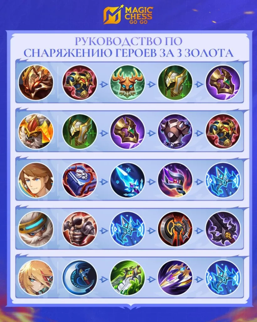 Рекомендованное снаряжение для героев за 3 золота Magic Chess Go Go.