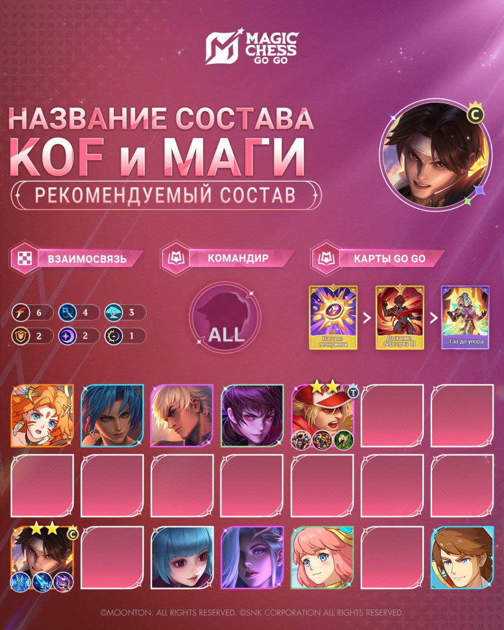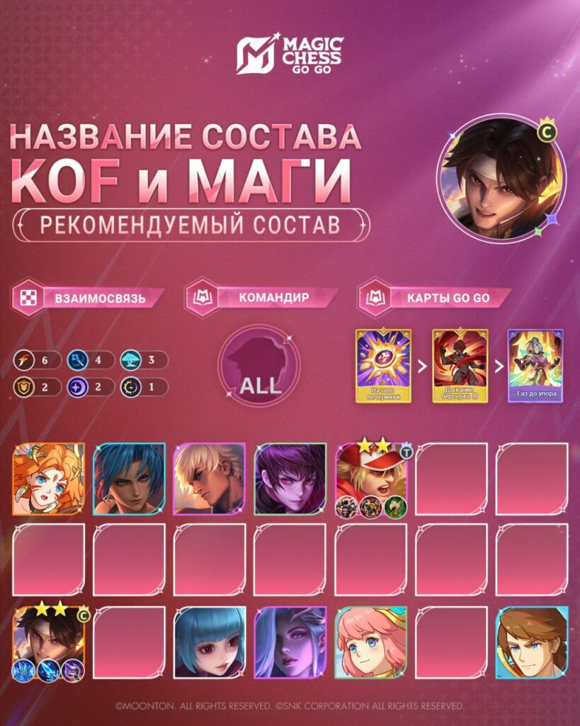 В ранней игре экономим золото и используем героев KOF и Магов для перехода. Как можно скорее достигаем 8-го ур. командира, чтобы собрать состав из 6 KOF и 4 Магов. Затем повышаем уровень до 9-го, обновляем магазин, чтобы получить 2-зв. Кё Кусанаги, и добавляем в состав Эдит. Наконец, стремимся к 10-му ур., чтобы активировать взаимосвязь 3 Beyond the Clouds и завершить состав.