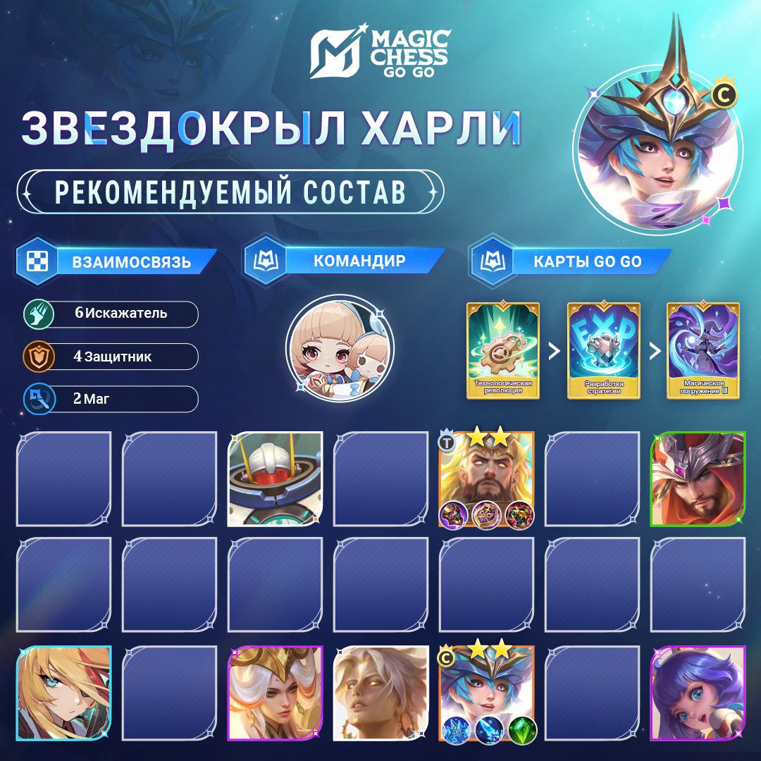 В ранней игре начните с Атласа, Матильды, Хилоса и Циклопа, чтобы сформировать состав с 2 Звездокрылами, 2 Приверженцами рока, 2 Защитниками и 2 Звездочетами, отдавая приоритет картам Go Go с ресурсами.