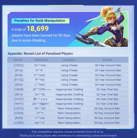 В отчёте даже выложили фрагмент списка: ID игроков, причины и сроки. Это публичный позор — предупреждение для всех. Почему это важно? Ранги — сердце MLBB. Они мотивируют прогрессировать, соревноваться в Mythic и выше. Бустинг убивает это, делая топы «пустышками».
