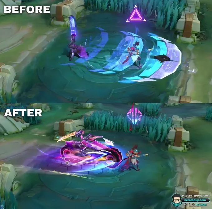 На опубликованных скриншотах ясно видно, как преобразился скин. Старая версия «Obsidian Blade» выглядела эпично, но теперь она кажется архаичной по сравнению с обновленной. В тизере от Xcalibur показаны кадры «до и после» для ультимейта Alucard. Раньше ульта активировалась через фиолетовый портал с мечом и вспышками — круто, но предсказуемо. Теперь? Alucard мчится на футуристическом мотоцикле с розово-фиолетовыми аурами, окруженный кристаллами энергии и вихрями плазмы! Броня героя обрела больше деталей: голографические панели, glowing глаза под маской и крылья на спине, добавляющие динамики.