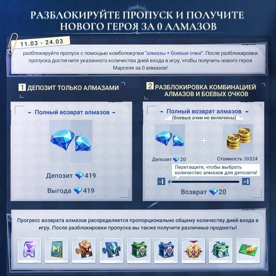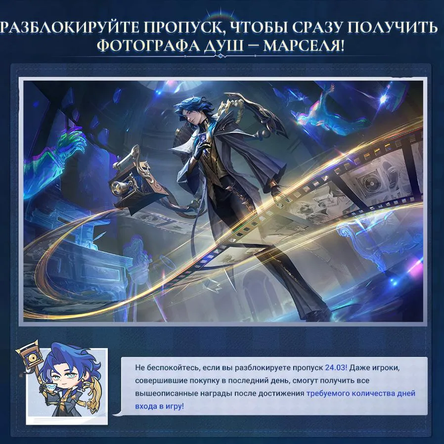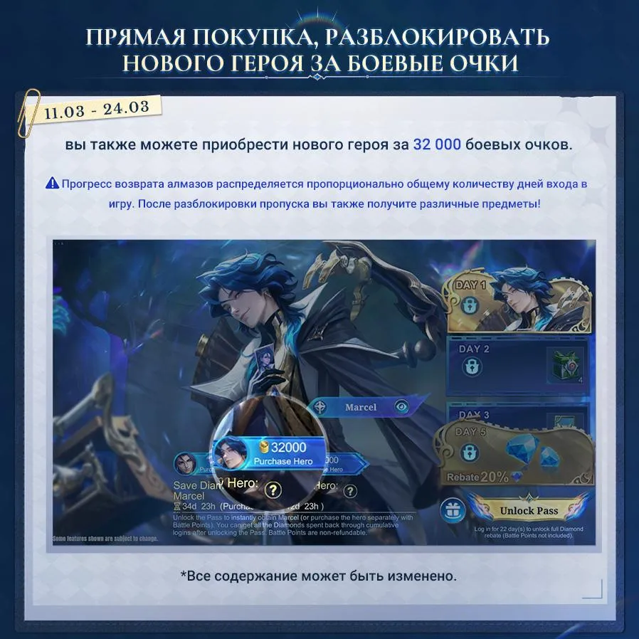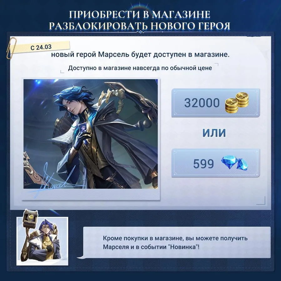 Главная » НовостиСобытие с новым героем Фотограф душ — Марсель На чтение 1 мин Просмотров 13 Опубликовано 08.03.2026 Новый герой, Фотограф душ — Марсель Mobile Legends Bang Bang, выйдет 11.03. Разблокируйте пропуск 11.03 и участвуйте во временном событии «Сэкономьте алмазы, получите нового героя», чтобы получить Марселя всего за 0 алмазов!